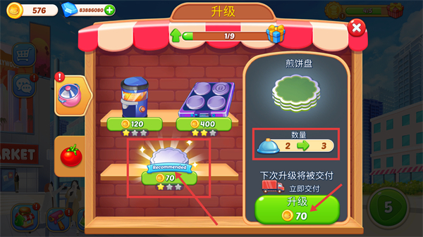 1、在升级界面消耗【70-金币】升级【煎饼盘】,使其数量从2提升至3,增强制作效率,后续可关注其他设备的升级选项。