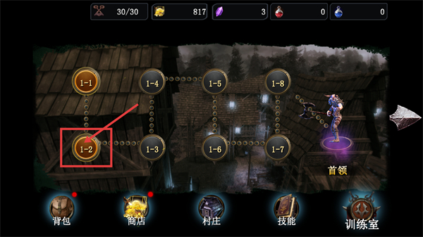 1、在关卡选择界面点击【1-2】进入对应关卡,该关卡属于第一章的后续内容,可逐步推进解锁后续关卡。