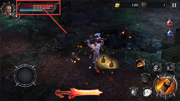 2、战斗中留意自身血量(如【94/100%】),击败敌人后会掉落金币等道具,及时拾取以积累资源。