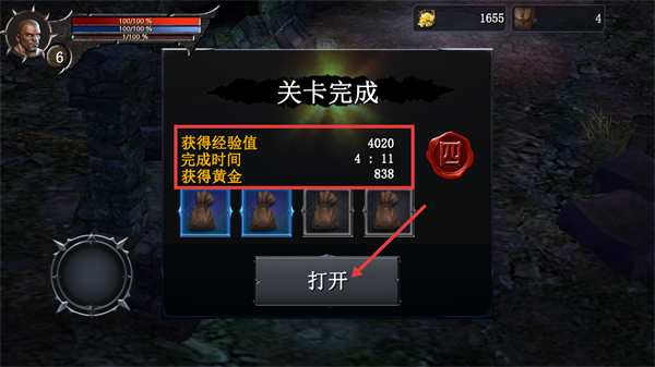 4、关卡完成后可获得【4020-经验值】与【838-黄金】,点击【打开】领取奖励,助力角色升级与资源积累。