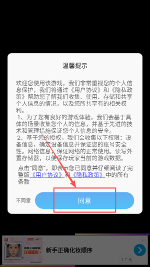 1、进入游戏:打开温馨提示界面,点击“同意”按钮,直接进入游戏主界面。