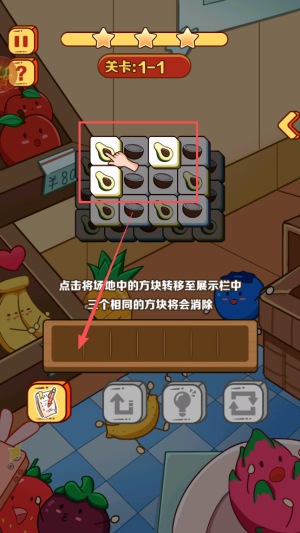 3、开始游戏:在关卡界面查看提示“点击将场地中的方块转移至展示栏中”,连续点击三个相同方块完成消除。