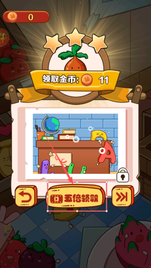 4、领取奖励:通关后点击“领取金币:11”,再点“五倍领明”观看广告,获得额外金币奖励。