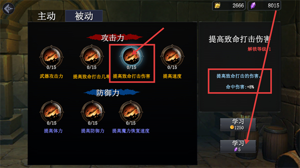 1、在被动技能界面学习【提高致命打击伤害】,消耗1250金币解锁后可获得【+8%-命中伤害】,提升输出能力。