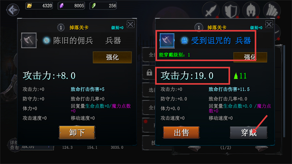 2、选择【受到诅咒的-兵器】穿戴,其【19.0-攻击力】属性优于旧武器,能显著提升战斗伤害,增强作战效率。