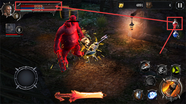 3、战斗中自身血量(如【60/100%】)不足时,可使用右侧的回复道具(各9个)补充状态,持续作战。