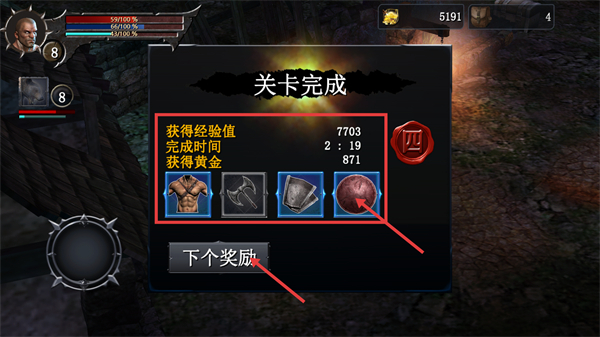 4、关卡完成后获得【7703-经验值】与【871-黄金】等奖励,点击【下个奖励】可领取后续道具,积累资源用于养成。
