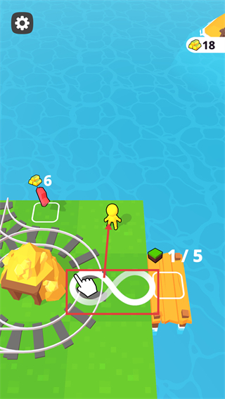 1、通过滑动“无限符号”轨道控制角色移动,收集场景中的金币(如6个金币),同时推进轨道建设进度(当前1/5)。