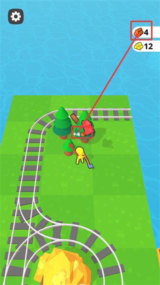 2、砍伐树木获取木材(单次+4),积累木材资源用于后续轨道或建筑升级,右上角会显示当前木材数量。