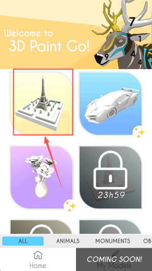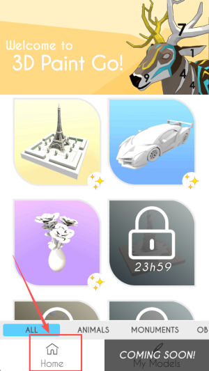 1、进入游戏:点击“Home”进入“3D Paint Go!”主界面,查看倒计时23h59。