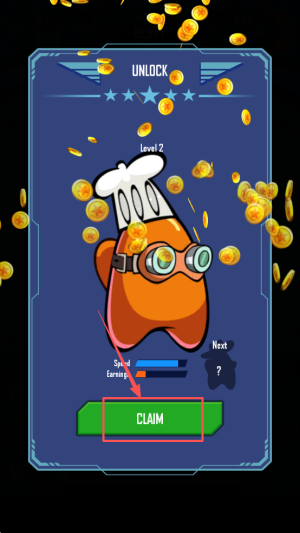 4、领取奖励:出现“UNLOCK”提示后点击“CLAIM”,领取解锁道具并继续升级收益。