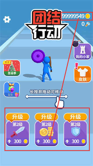1、按【长按并拖动可移动】控制角色,消耗金币升级【第2级】的属性,提升队伍的战斗与收益能力。
