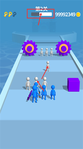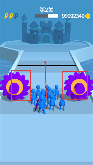 1、开局独自出发,在奔跑途中不断聚集散落的人群壮大队伍规模,带领日益庞大的团队,穿越移动、旋转、膨胀等不同类型的障碍考验。