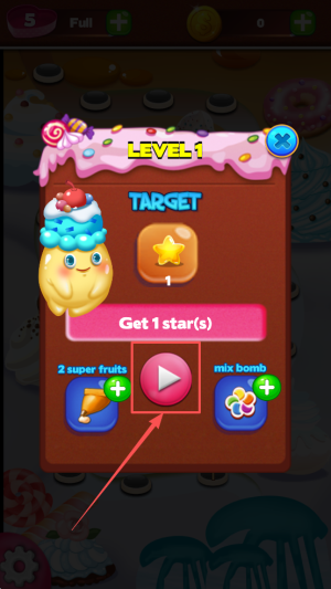 2、选择关卡:在关卡列表点击“LEVEL1”,查看目标要求“Get 1 star(s) 2 super fruits mix bomb”。