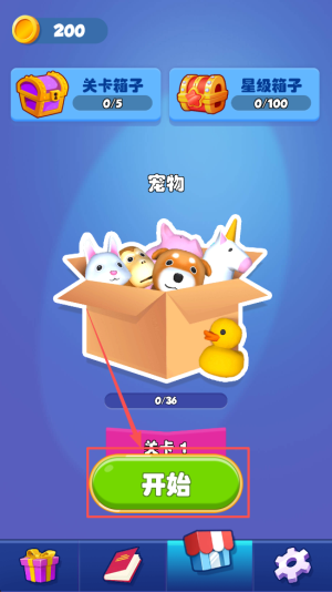 1、进入游戏:点击主界面“开始”按钮,查看关卡箱子与宠物收集进度。