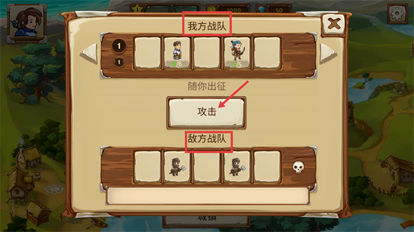 1、配置【我方战队】成员后,点击【攻击】按钮开启与【敌方战队】的对战流程。