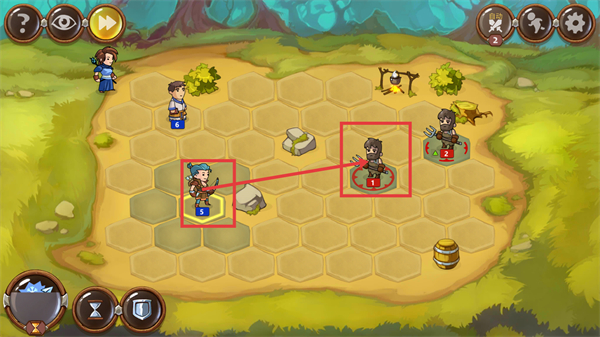 3、在六边形战场中操控我方单位(如标识【5】的角色),移动至敌方单位(标识【1】)的攻击范围发起进攻。