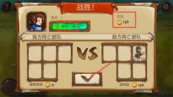 4、战胜后可获得【经验:+6】与【奖励-136】金币,点击确认按钮领取并推进游戏进程。
