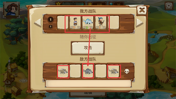1、在【我方战队】配置含召唤物的阵容后,点击【攻击】按钮挑战由【恶狼】组成的【敌方战队】。