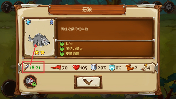 2、【恶狼】拥有【18-21】的攻击区间与【105】生命值,其【皮糙肉厚】特性适合承担承伤角色。