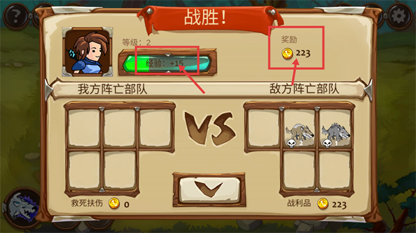 4、战胜后可获得【经验:+15】与【奖励-223】金币,点击确认按钮领取奖励并推进游戏流程。