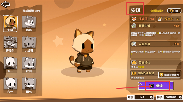 1、选择【安琪】作为出战角色,其【狂野生长】技能可额外获得生命值,点击【继续】进入对局。