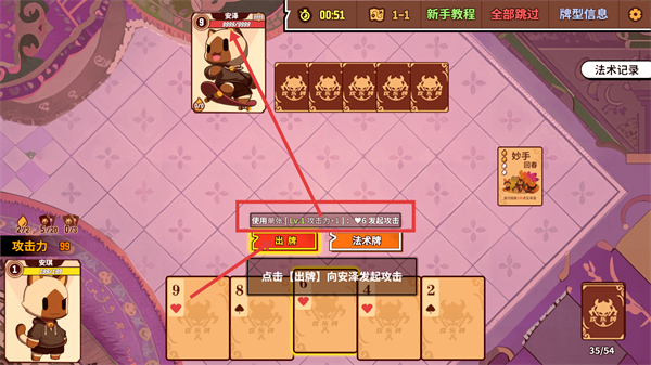 3、使用单张【Lv.1攻击力+1】卡牌,点击【出牌】向敌方【安泽】发起攻击。