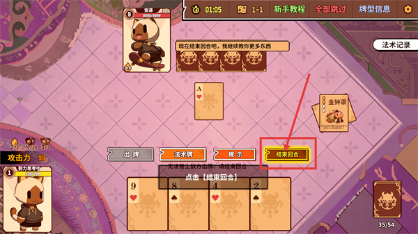 4、完成出牌操作后,点击【结束回合】推进流程,等待敌方行动并学习后续玩法。