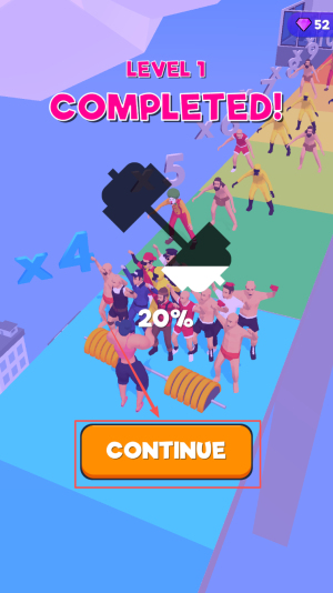 4、完成挑战:待“LEVEL1 COMPLETED!”弹出且进度达20%,点击“CONTINUE”进入下一关。