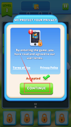1、进入游戏:阅读隐私条款后点击“ACCEPTED”,再点“CONTINUE”进入主界面。
