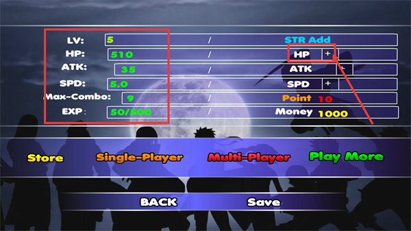 1、在属性界面使用【Point】提升【HP】,增强角色生存能力,同时积累【EXP】推进【LV】升级。