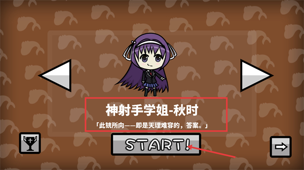 1、选择【神射手学姐-秋时】角色后,点击【START!】按钮进入关卡,该角色擅长远程攻击需利用其特性。