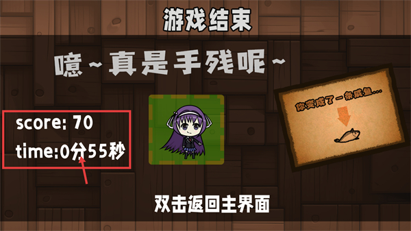 4、挑战结束后查看【score:70】与【time:0分55秒】数据,通过双击返回主界面优化操作后重新挑战。