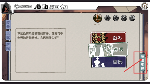 1、遇到雾气中模糊影子的选择界面时,可从【战斗】【奇遇】【删牌】中选选项,选后点【继续旅程】推进,左侧功能可辅助配置。