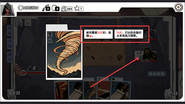 2、使用【罡风】卡牌时,需注意其【被弃置或消耗时:获得♦】的效果,结合敌人【29/29】血量规划使用。