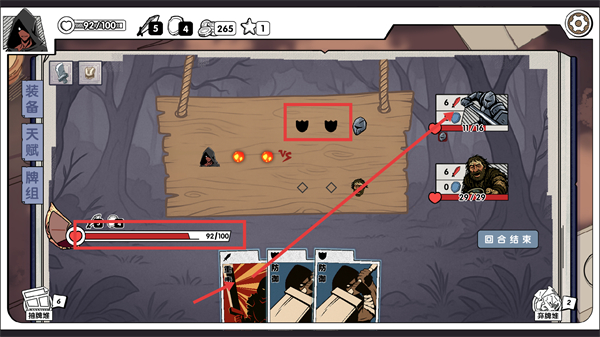 3、战斗中关注自身【92/100】血量,利用【重击】【防御】卡牌攻防,敌方【11/16】血量时可集中输出,适时点击【回合结束】。