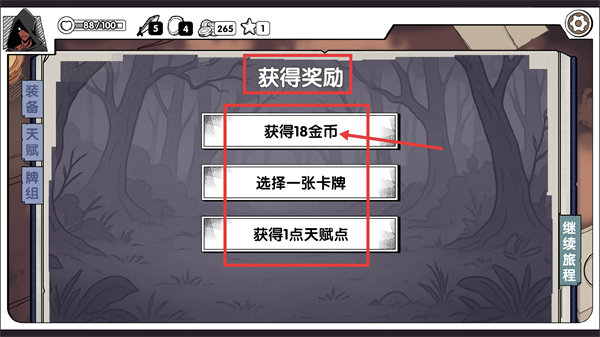 4、战斗胜利后在【获得奖励】界面,可获取【18金币】、选卡牌、得【1点天赋点】,选后点【继续旅程】推进关卡。