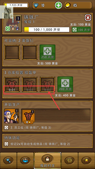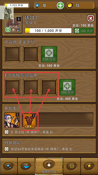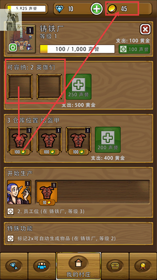 4、盔甲制作完成后,可消耗资源解锁【可容纳:2英雄们】的工位,提升建筑生产效率。