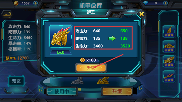 1、在【机甲仓库】中,消耗【100-金币】对【狮王】机甲执行升级,可提升其【攻击力-640→650】【防御力-135→138】等属性,增强战力。