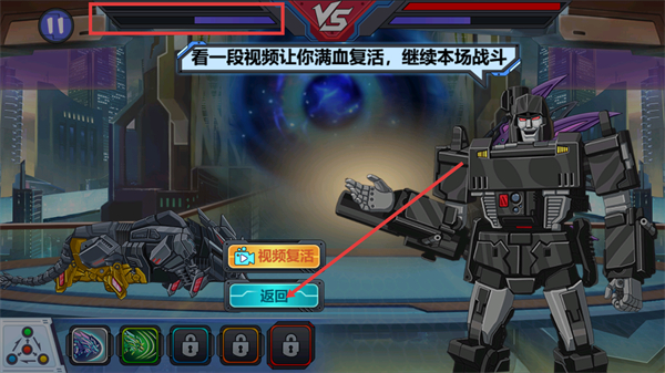 4、战斗失败后,可选择【看一段视频让你满血复活-继续本场战斗】的【视频复活】选项,快速重回对战,避免重新开局。