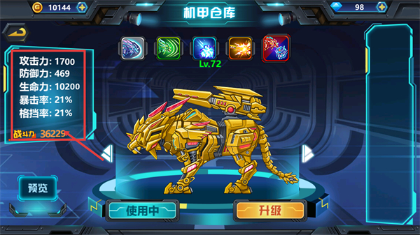 1、在【机甲仓库】查看当前机甲的【攻击力-1700】【防御力-469】等属性,点击【升级】可提升这些数值,增强【战斗力-36229】。