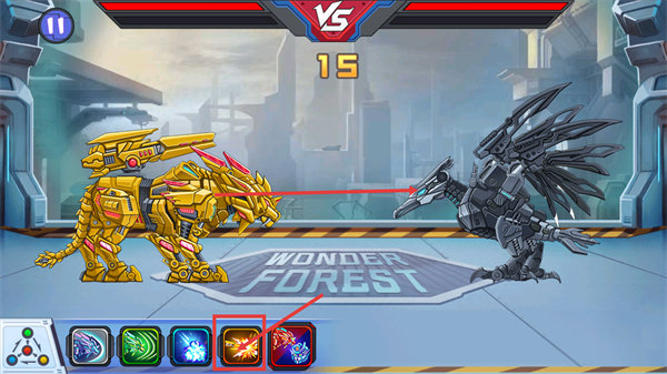 3、进入【VS】对战后,注意上方的【15】倒计时,同时利用解锁的技能图标,在【WONDER-FOREST】场景中及时释放技能输出。