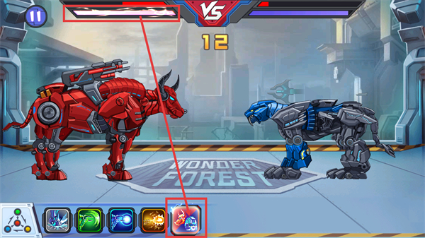 2、进入【VS】对战后,关注上方的【12】倒计时,同时利用解锁的技能图标,在【WONDER-FOREST】场景中及时释放技能输出。