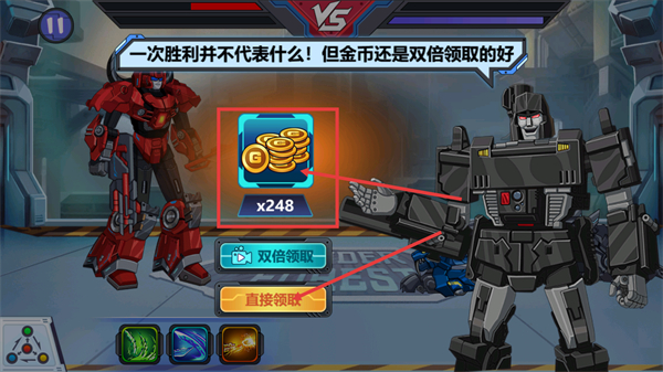 4、战斗胜利后,可选择【直接领取】获得【x248-金币】,也可通过【双倍领取】看视频获取翻倍奖励,加速资源积累。