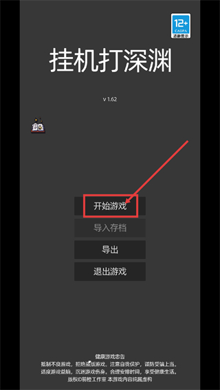 1、进入【挂机打深渊-v1.62】界面后,点击【开始游戏】进入游玩,注意该游戏适配【12+-CADPA适龄提示】对应的用户群体。