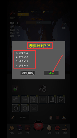 4、升级后会获得【力量+1.2】【敏捷+1.2】等属性加成,点击【确认】完成升级,提升角色能力以应对更高难度副本。