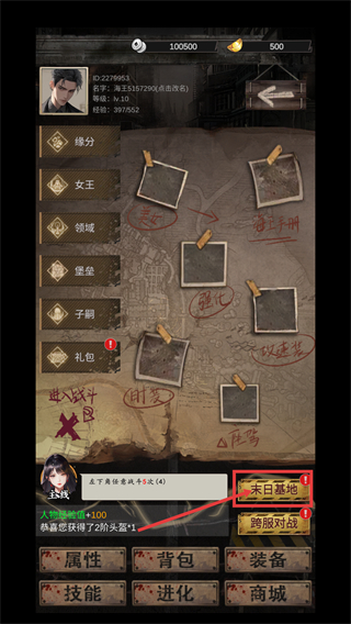 1、完成【左下角任意战斗-5次(4)】主线任务,可获取【人物经验值+100】与【2阶头盔*1】,点击【末日基地】推进流程。