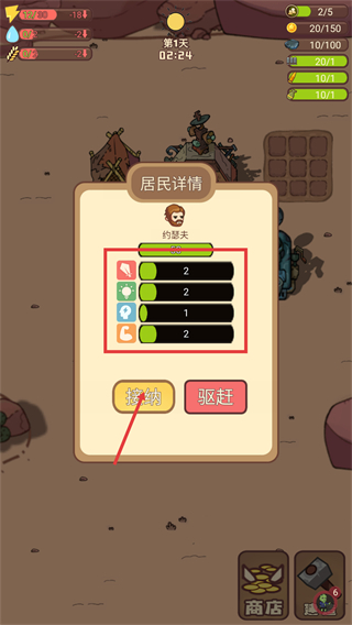 2、查看【居民详情】中【约瑟夫】的属性数值后,点击【接纳】可将其纳入阵营,提升资源产出效率。