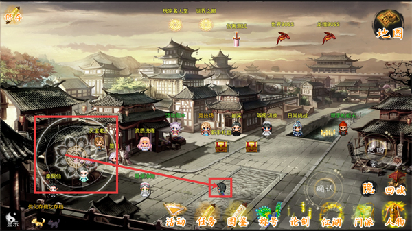 2、在城镇场景中,可与【秦假仙】等NPC交互获取功能服务,同时可通过界面功能按钮参与【活动副本】-【竞技场】等玩法。