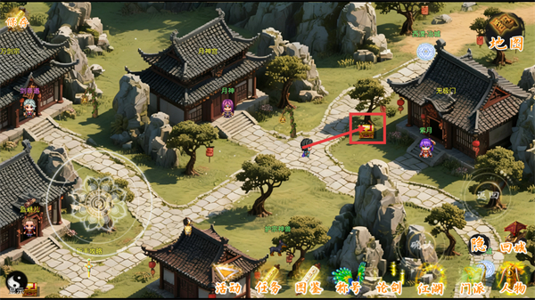 3、在门派场景(如月神宫-无极门区域)中,注意探索场景内的宝箱类交互物,点击可获取对应道具资源,助力初期养成。
